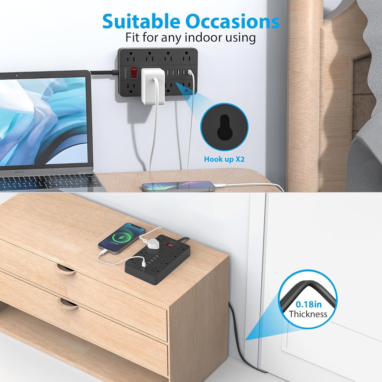 - Flat Plug Power Strip and Wall Mountable : With only 0.35 inch ultra slim design, this surge protector power strip has a flat plug in real sense,so that it could be easily hide in the back the furniture, beds or refrigerators.There is 2 hook hole for wall hanging on the back, so you can use it hanging on the wall, It can be easily placed anywhere on the desk or on the wall.