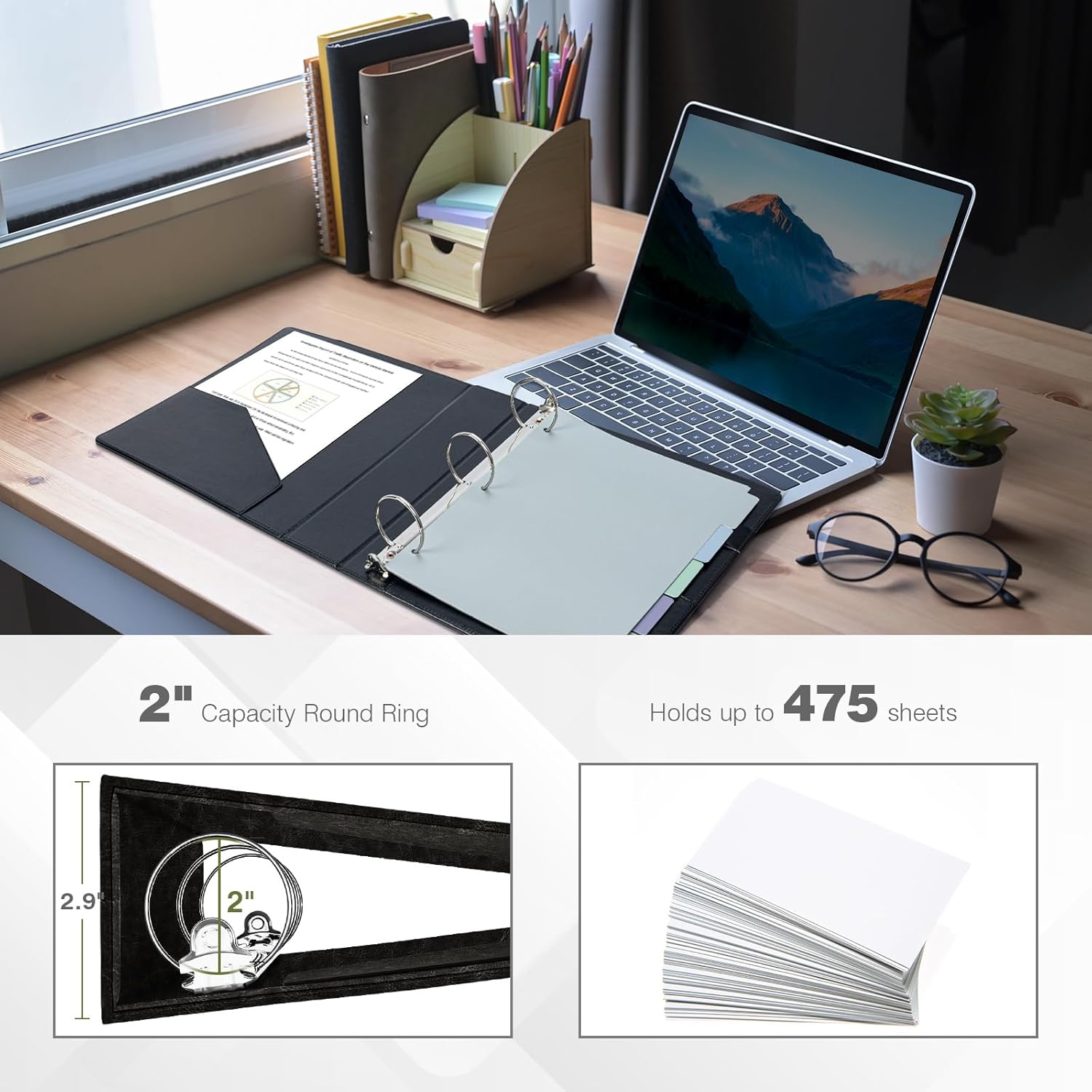 - 【Versatile】2 inch sturdy round ring, can hold 400 sheets of paper securely. The interior features two pockets to store letter-sized documents and important loose papers. Also comes with a divider for 5 tabs and a sheet of stickers (the tabs fit perfectly into the divider) for easy organization. The design of the clipboard is convenient for fixing paper and taking it out for writing at any time.