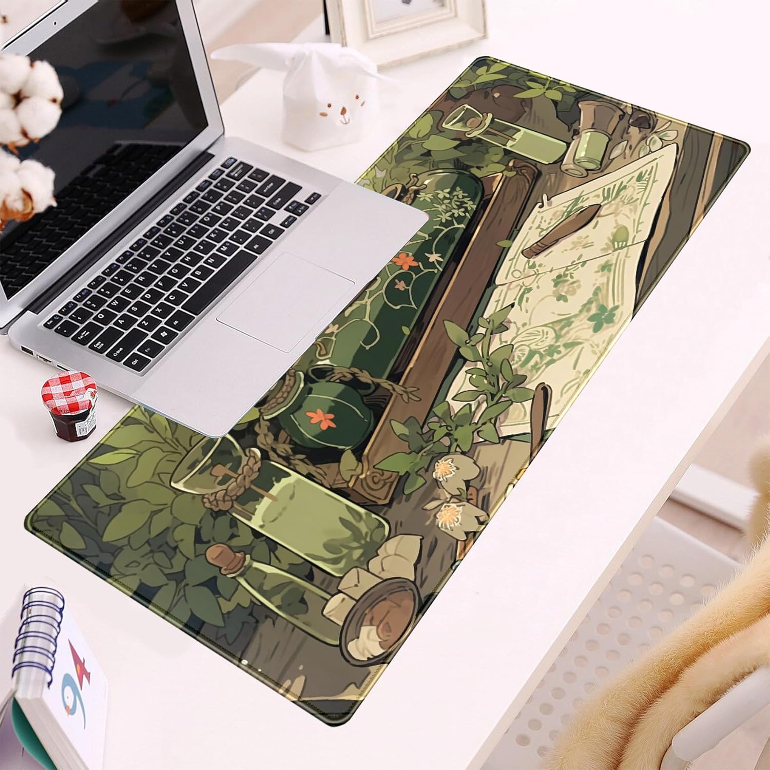 Cute Green Plants Desk Mat Anime Sage Mouse Pad Gaming Desk Pad XL, Kawaii Aesthetic Laptop Computer Keyboard and Mouse Mat, Desktop Decor Accessories Mousepad for Girl Women Office 31.5"x11.8"