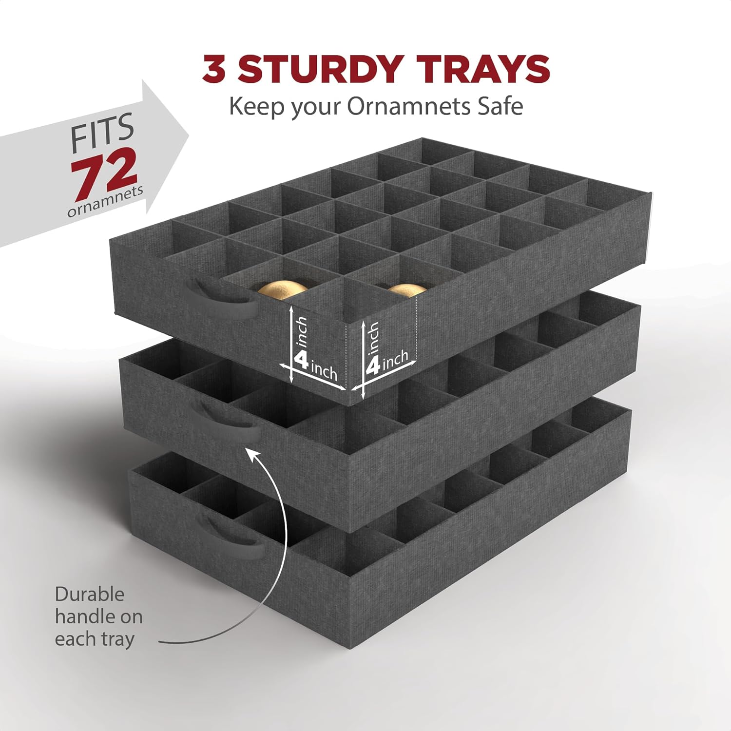 - HOLDS UP TO 72 LARGE ORNAMENTS: Includes 3 adjustable trays, each tray fits up to 24 ornaments. Designed to store ornaments up to 4" tall and nearly any width. Overall size: 27”W x 19”D x 14”H, giving you ample room for all your cherished holiday decorations.