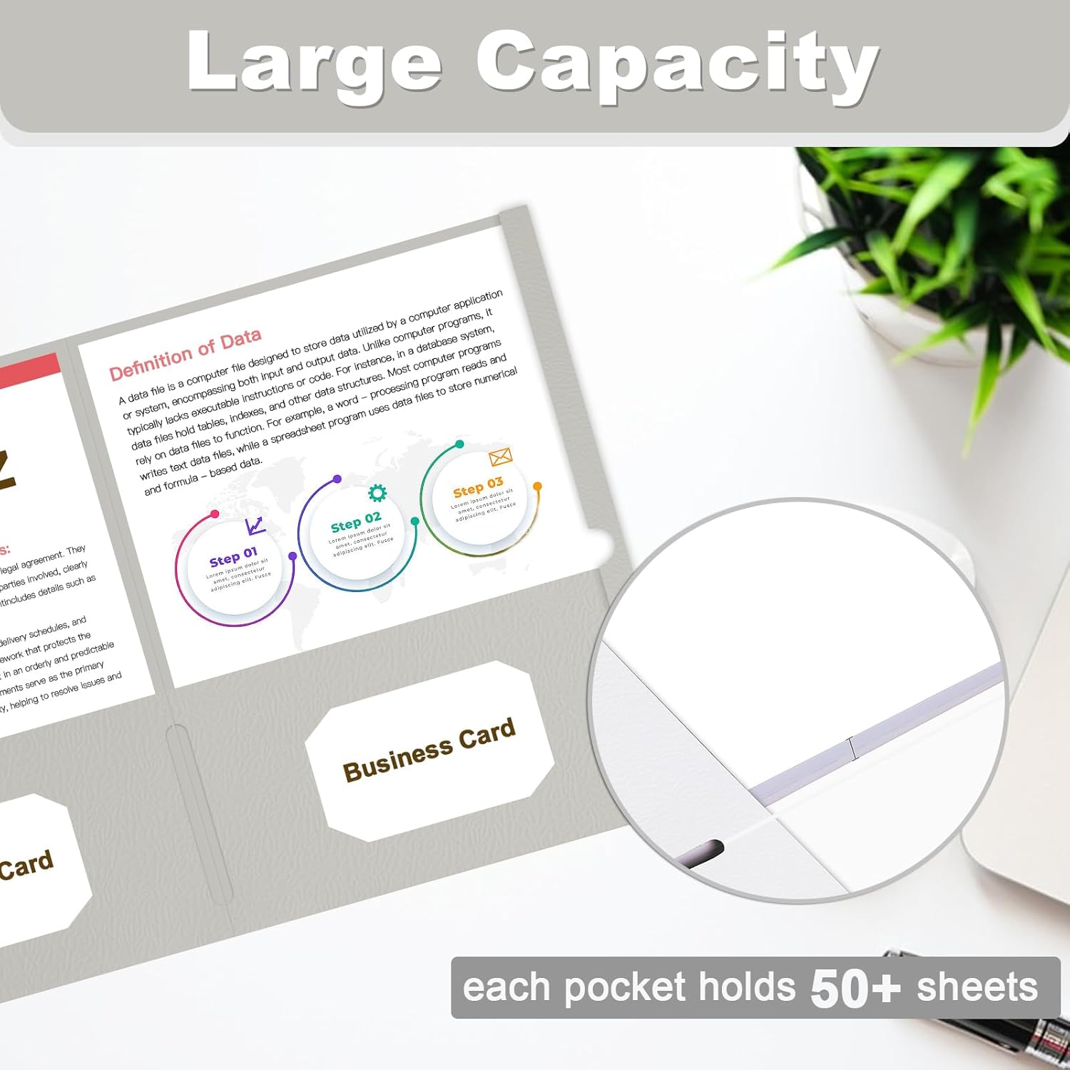 - Large Capacity: 60 pack pocket folder has two deep pockets that hold over 50 sheets of paper each. 2 business card slots for instant access to important contacts without the need for a separate business card holder.