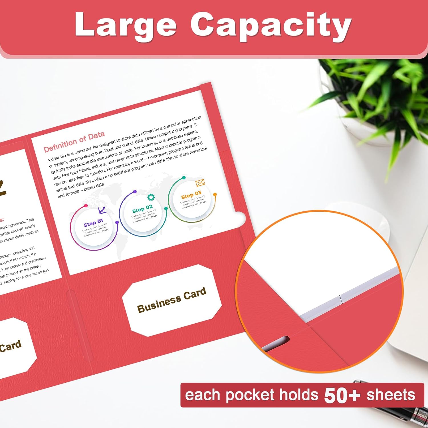 - Large Capacity: 60 pack pocket folder has two deep pockets that hold over 50 sheets of paper each. 2 business card slots for instant access to important contacts without the need for a separate business card holder.