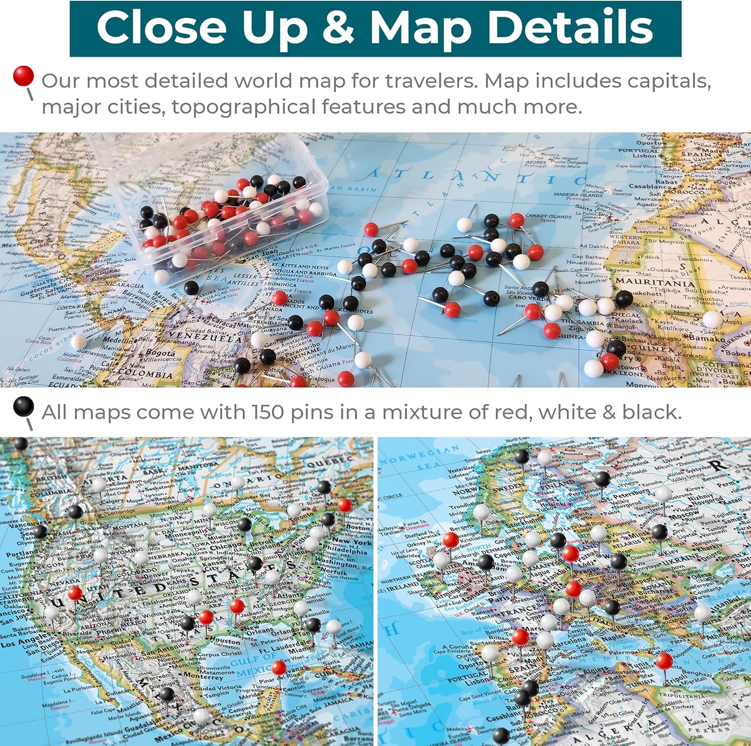 - Includes 150 Color Pins for Mapping Adventures – Every push pin map comes with 150 red, white, and black pins so you can mark places visited, dream destinations, and favorite memories with ease.