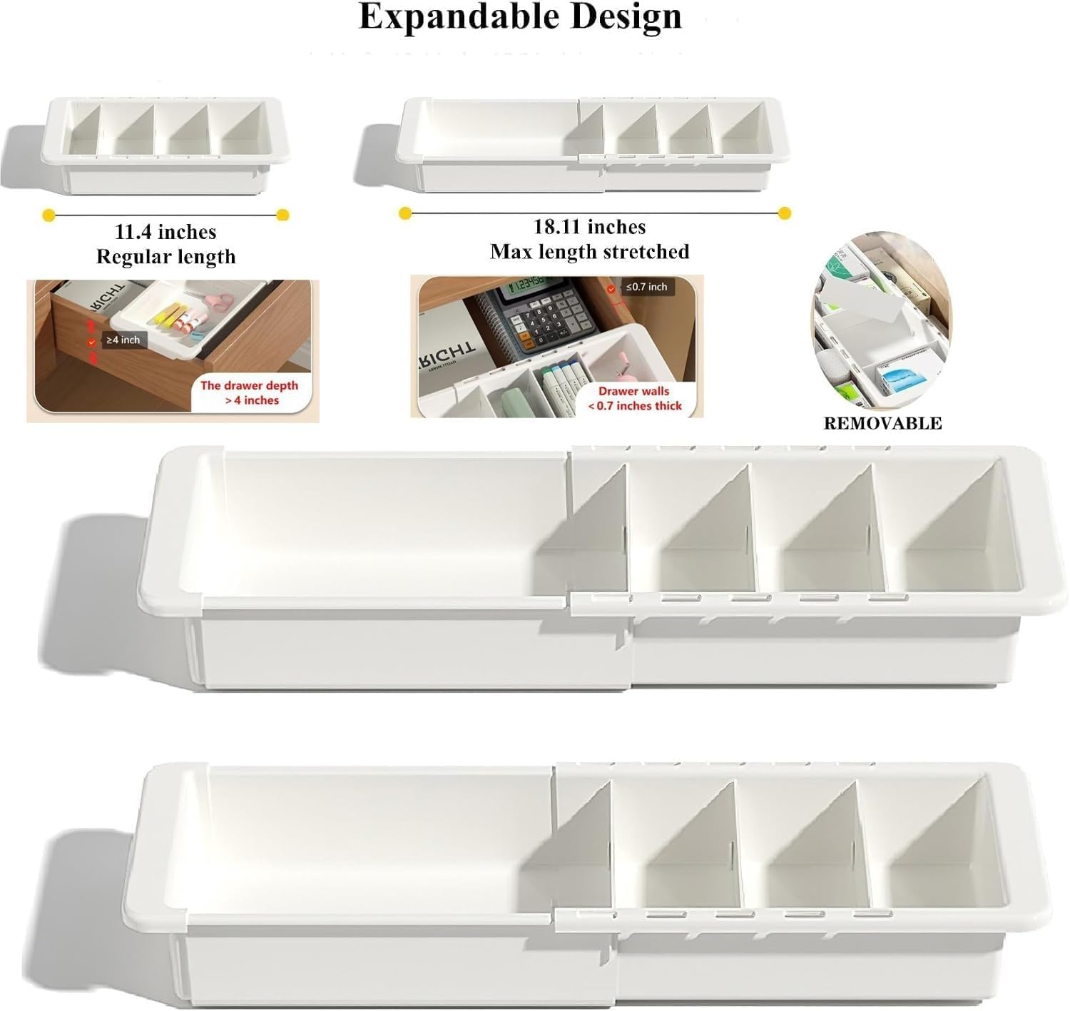 - 1. QUICK SET-UP: Tray expands from 11.4 to 18.11 inches to fit drawers horizontally or vertically and two adjustable dividers create 8 compartments to hold all the small things