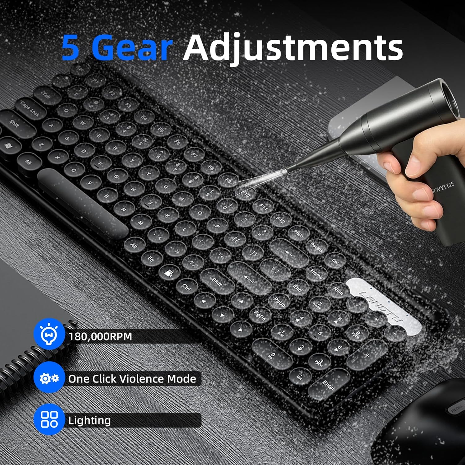 - [180,000 RPM Super Speed & 5-Gear Wind Speed] Compressed air duster with a maximum rotation speed of up to 180,000 RPM, it offers 5-level wind speed adjustment and is equipped with an LED lighting lamp. It can effortlessly clean tiny dust particles from doorframes, toy models, fan blades, pets, keyboards, falling leaves, snow and more. You can freely switch the wind speed to meet your various cleaning needs.