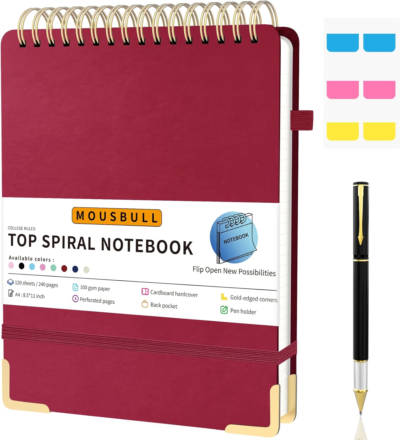 Mousbull Top Spiral Notebook, A4 Hardcover Top Bound Steno Pads, 240 Pages 100gsm College Ruled Left Handed Notebook Journal for Work, School, Meeting Writing - Red, 8.5" x 11"