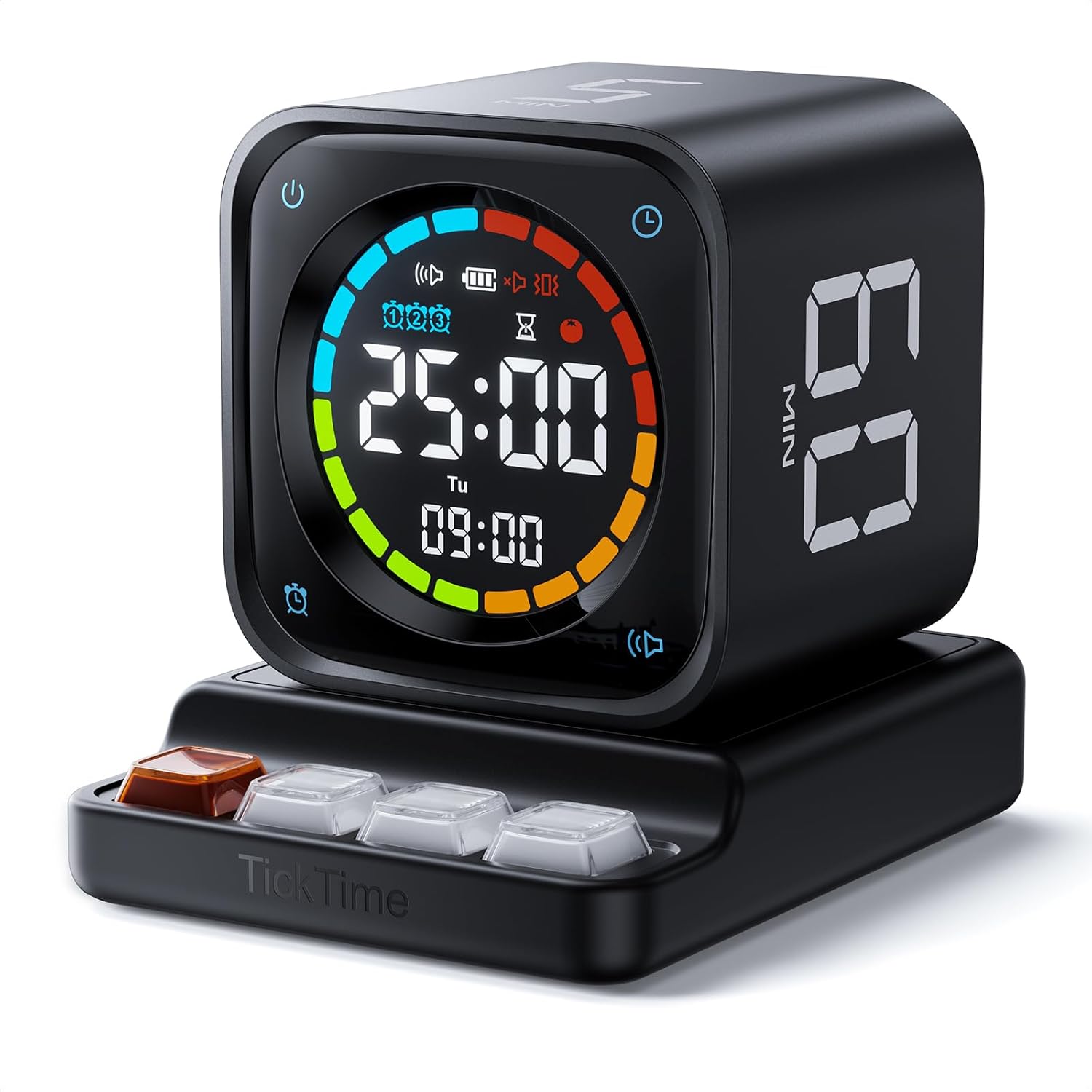 TK3 Pomodoro Timer Cube, Desk Productivity Timer with 5/10/30/60 Min Presets, Custom Countdown, Stopwatch, Clock, 3 Alarm, Silent, Vibrate & Sound Mode, for Task, ADHD, Study, Kitchen (Obsidian Black)