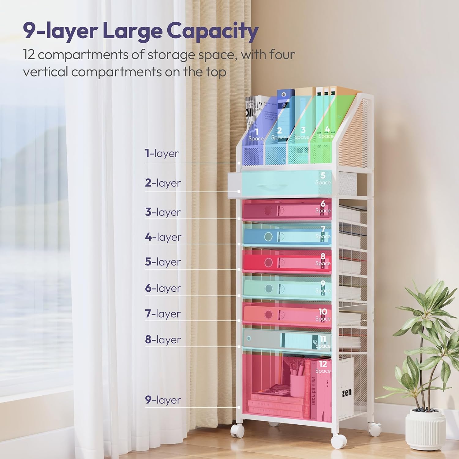 SWTYMIKI 9-Tier Rolling File Cart - Paper Organizer with Drawer and Trays, Wood Desk Office Organizer, Office Organization and Binder Storage for Workspace, Home, School, White