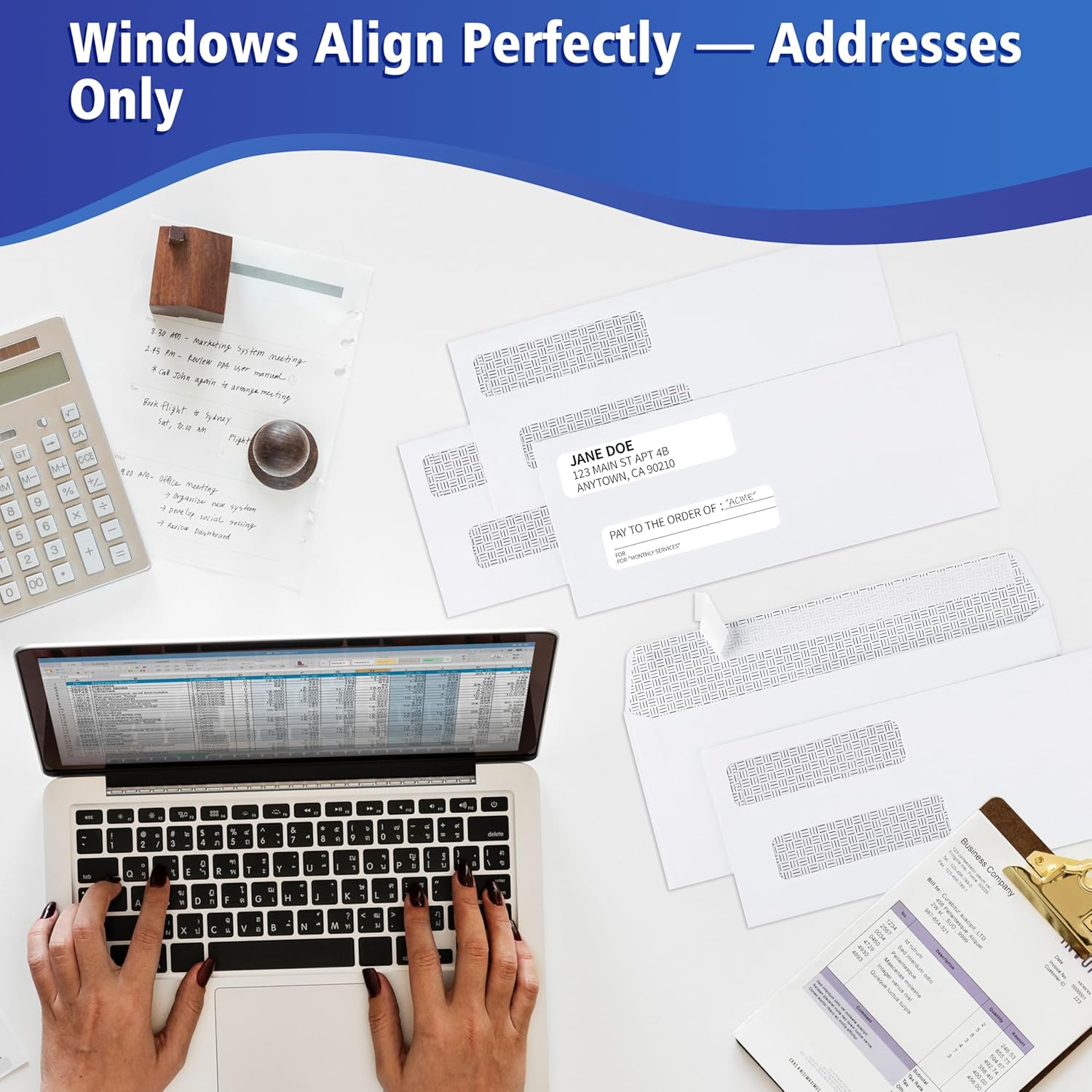 - 【Double Window Design】The double windows align precisely with the return and recipient addresses while keeping the memo line and check amount fully concealed.These #8 double windows that perfectly align with most business mailings, including invoices, statements, payroll checks, and return documents.